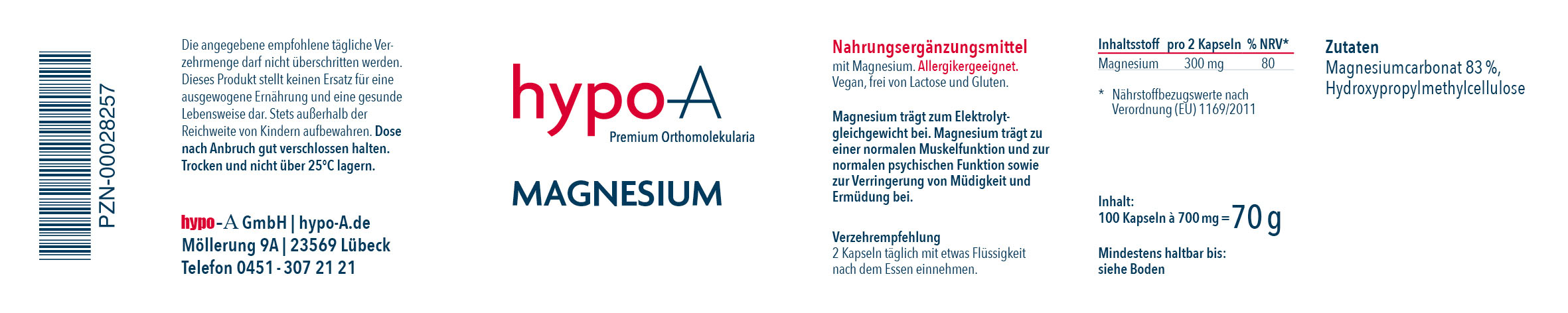 Der Tagesbedarf für Magnesium liegt laut DGE für Erwachsene bei 300-400 mg. Unterschiede gibt es je nach Alter und Geschlecht. Dabei hängt unser Magnesiumbedarf auch von unserem Lebensstil ab: Intensiver Sport und Stress lassen unseren Magnesiumbedarf steigen. Magnesiumkapseln von hypo-A bieten eine bequeme Möglichkeit den Magnesiumspiegel zu erhöhen. Und das ganz ohne Zusatzstoffe! Bei einem Magnesium-Gehalt von 150 mg Magnesium (reiner Magnesiumanteil) pro Kapsel, decken zwei Kapseln hypo-A Magnesium bis zu 100 % des täglichen Bedarfs.